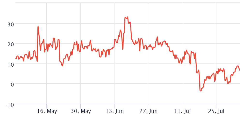 For reference, the higher the index, the less inclined traders are to price downside risk. As displayed above, the skew indicator exited “fear” mode on July 16 as ETH broke above the $1,300 resistance. Thus, those option traders no longer have higher odds of a market downturn as the skew remains below 12%.