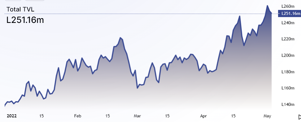 Terra’s main decentralized application metric increased by 41% over the past month as the network’s total value locked (TVL) hit an all-time high at 254 million LUNA.
