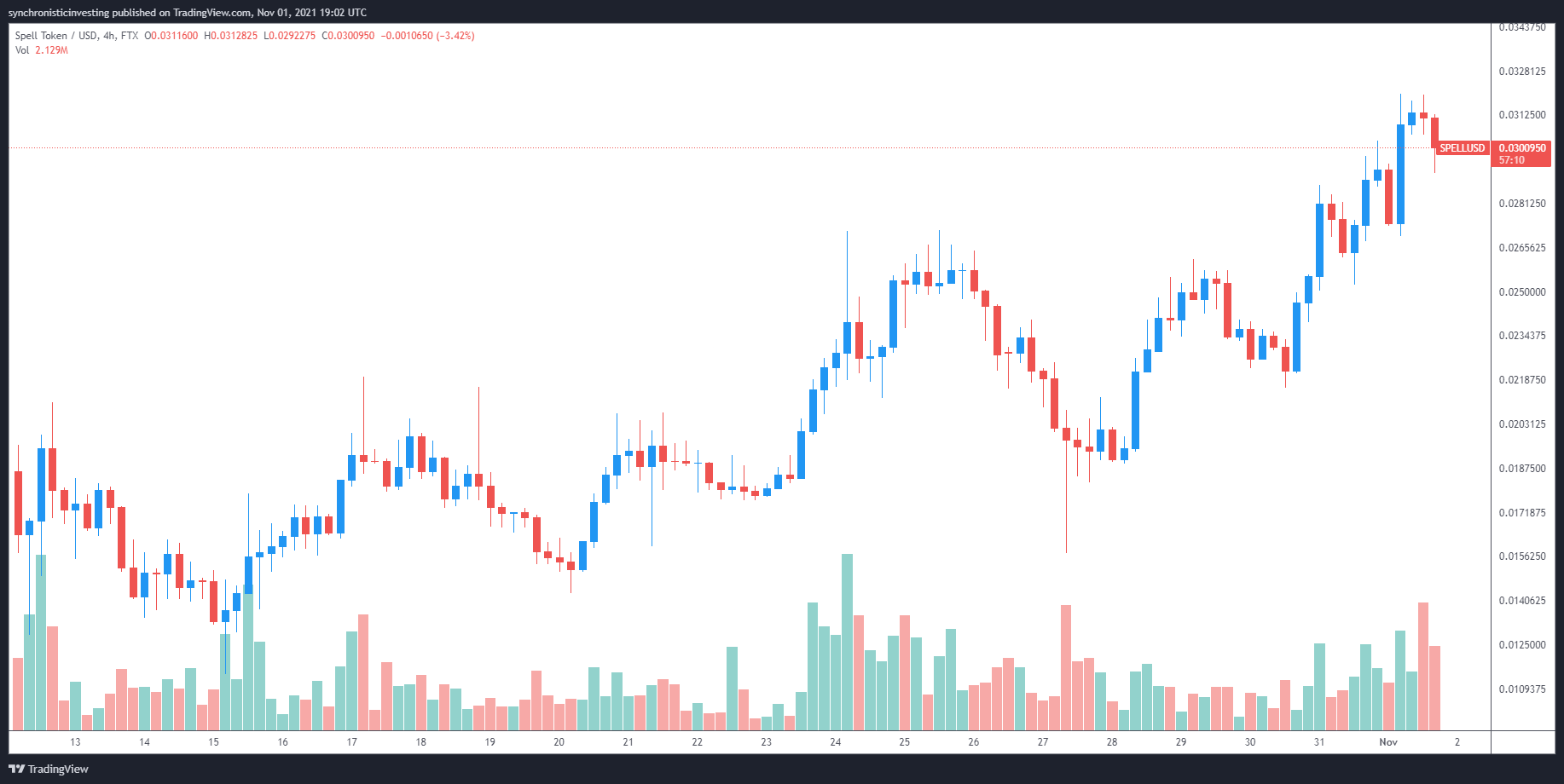 Data from Cointelegraph Markets Pro and TradingView shows that after hitting a low of $0.0114 on Oct. 15, the price of SPELL rallied 178.55% to establish a new record high at $0.035 on Nov. 1 as its 24-hour trading volume spiked to $109.82 million.