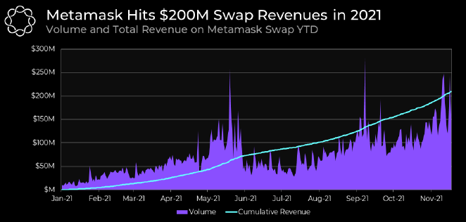 As a result of the increased swap volume and the 0.875% fee that MetaMask takes from each swap, the protocol has amassed $200 million in revenue in 2021. This figure is impressive, especially compared to competitors like SushiSwap, which has earned $70 million year-to-date and Curve which pulled in $12 million.