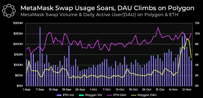 As shown in the graph above, the volume of Ether transacted through MetaMask Swap has seen a significant increase since late October and the daily active users (DAU) of MetaMask Swap on Polygon has surged from 2,000 on Nov. 6 to 9,000 on Nov. 12.