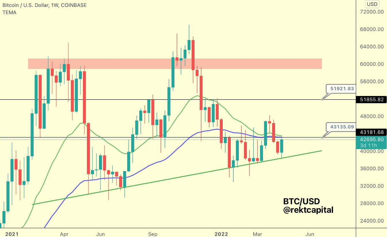 Analysis of Bitcoin’s weekly price action was discussed by crypto trader and pseudonymous Twitter user ‘Rekt Capital’, who posted the following weekly chart noting that “Bitcoin is now hovering below the green 21-week and blue 50-week bull market exponential moving averages (EMA).”
