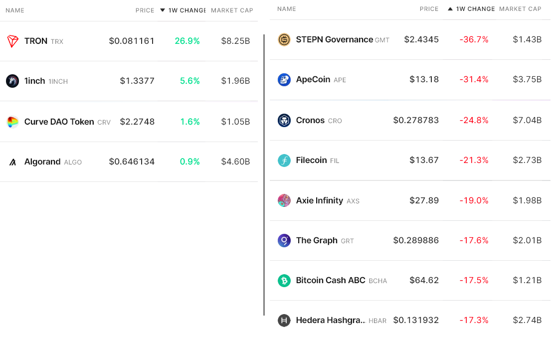 Weekly winners and losers among the top 80 coins. Source: Nomics