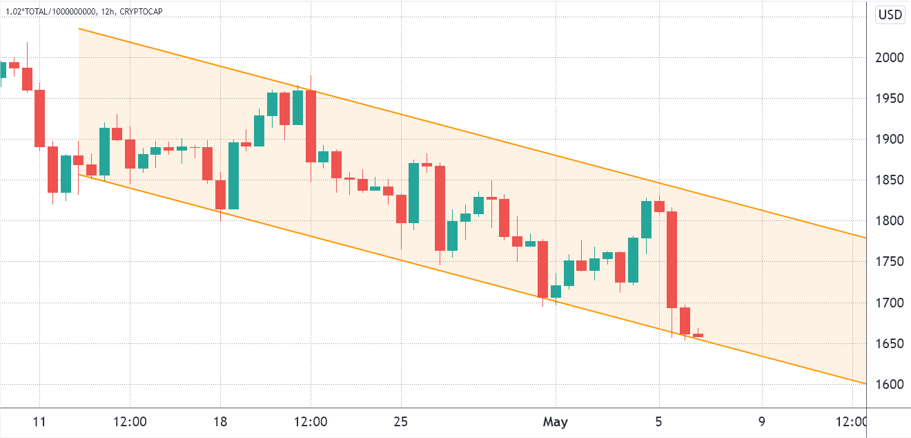 The total crypto market capitalization has been trading within a descending channel for 24 days and the $1.65 trillion support was retested on May 6. The drop to $1.65 trillion was followed by Bitcoin (BTC) reaching $35,550, its lowest price in 70 days.