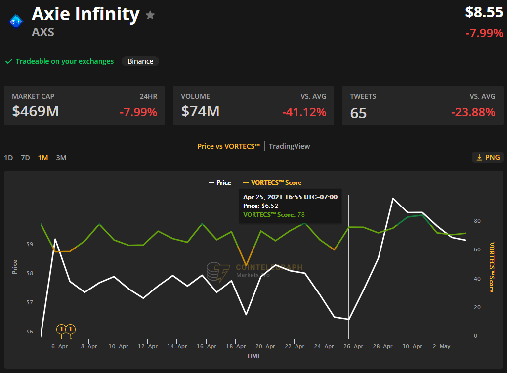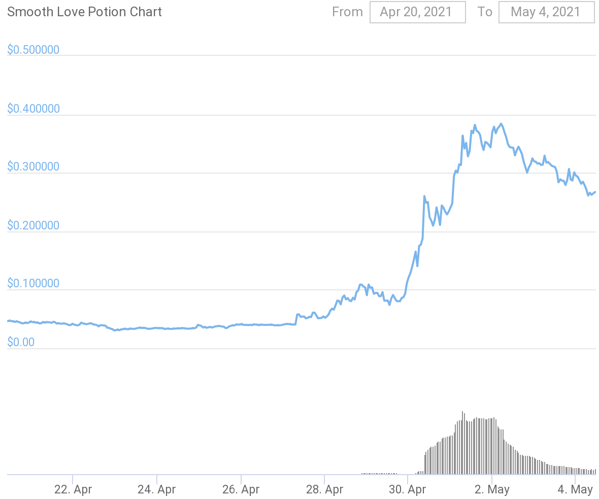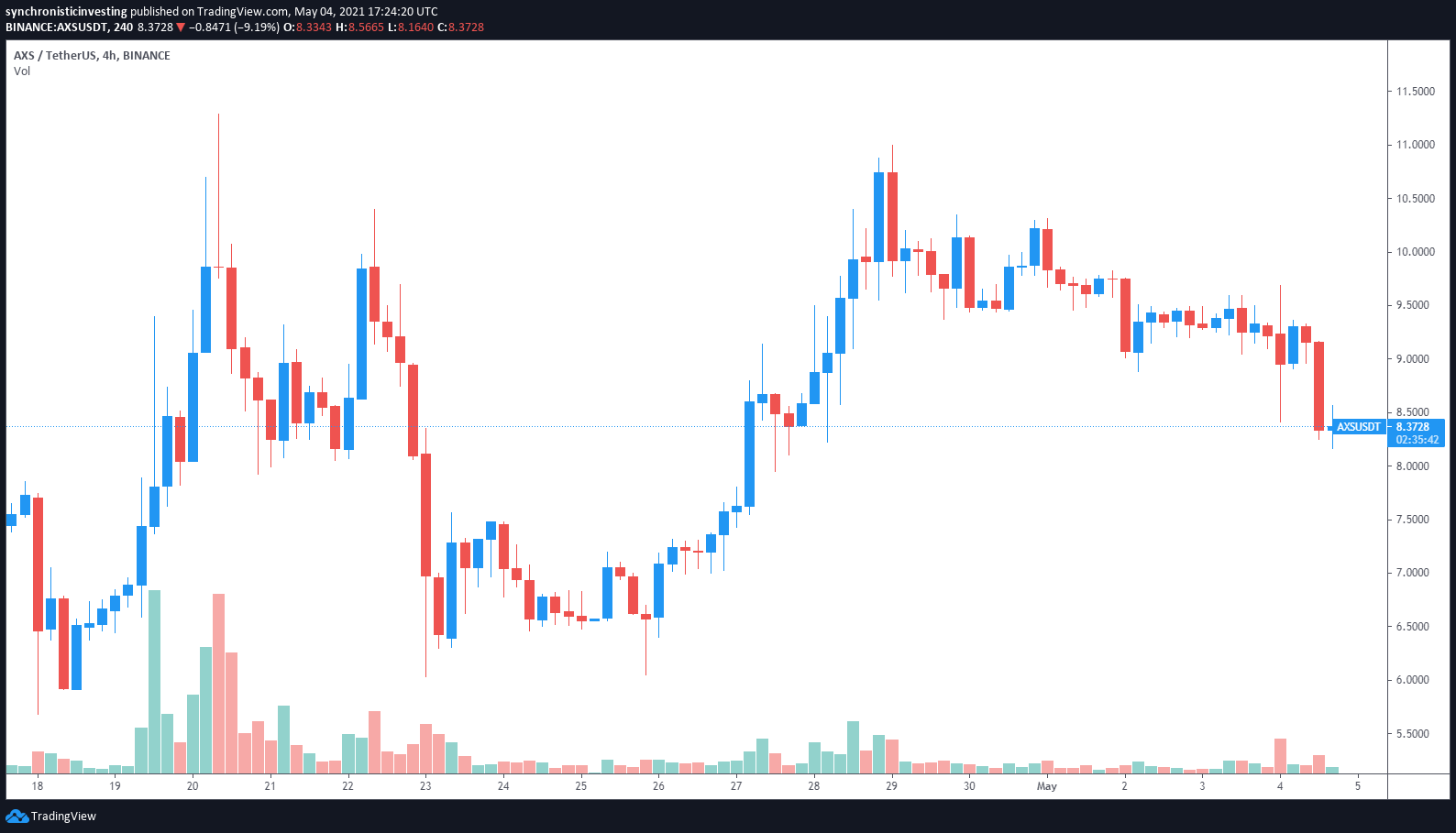 Data from and TradingView shows that the price of AXS rallied 83% from a low of $6 on April 25 to a high at $11 on April 29 while the price of SLP skyrocketed more than 1,000% from a low of $0.035 on April 25 to a new record high at $0.396 on May 2.