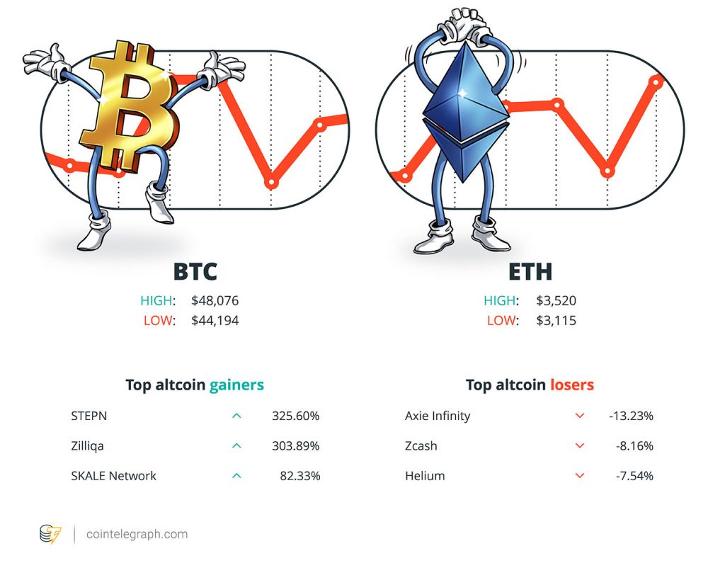 Among the biggest 100 cryptocurrencies, the top three altcoin gainers of the week are STEPN (GMT) at 325.60%, Zilliqa (ZIL) at 303.89% and SKALE Network (SKL) at 82.33% The top three altcoin losers of the week are Axie Infinity (AXS) at -13.23%, Zcash (ZEC) at -8.16% and Helium (HNT) at -7.54%.