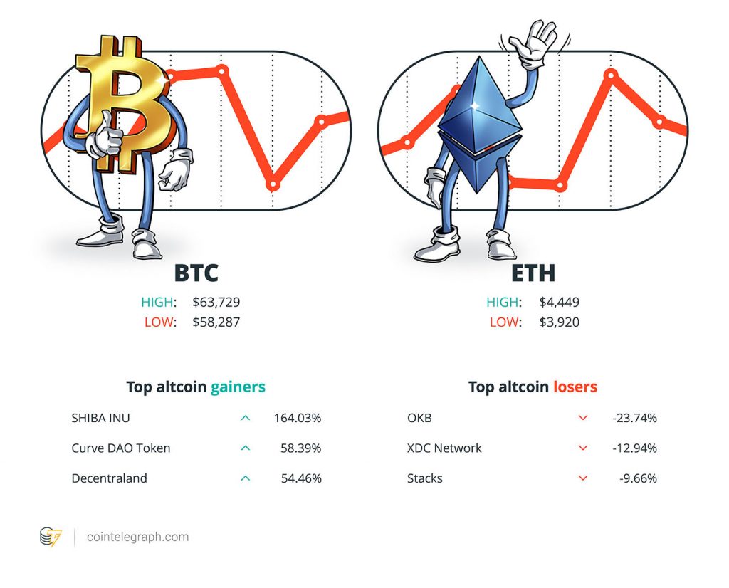 Bitcoins price sustained a bit of turbulence this week, trading above $63,000 before falling down to around $58,000, based on data from Cointelegraphs BTC price index. Following the dip, Bitcoins price rallied back up past $62,000.