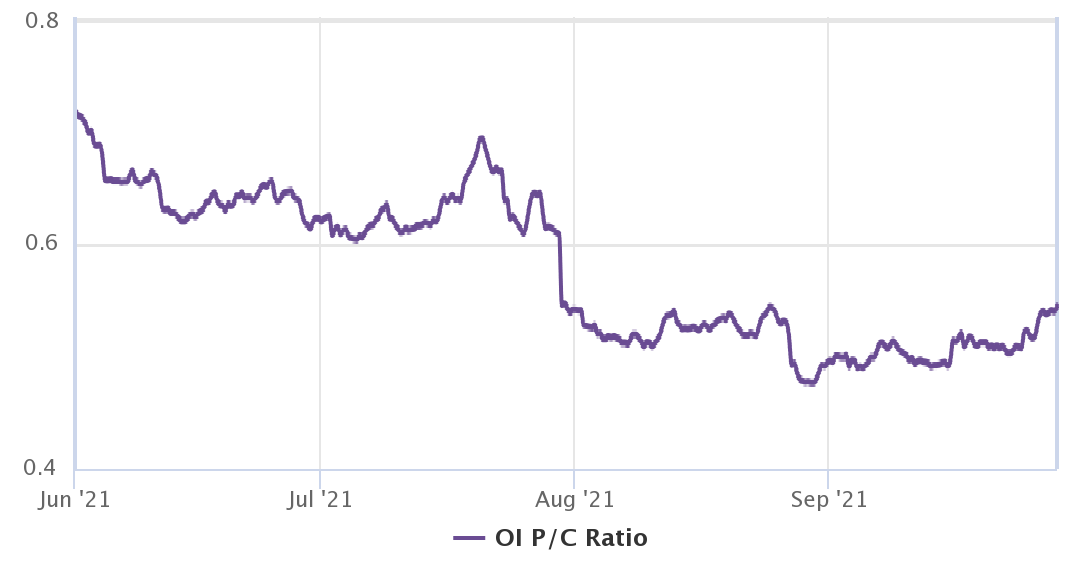 The indicator reached a 0.47 bottom on Aug. 29, reflecting the 50,000 BTC protective puts stacked against the 104k BTC call (buy) options. Still, the gap has been decreasing as the use of neutral-to-bearish put contracts started to get traction after the Sept. 24 monthly expiry.