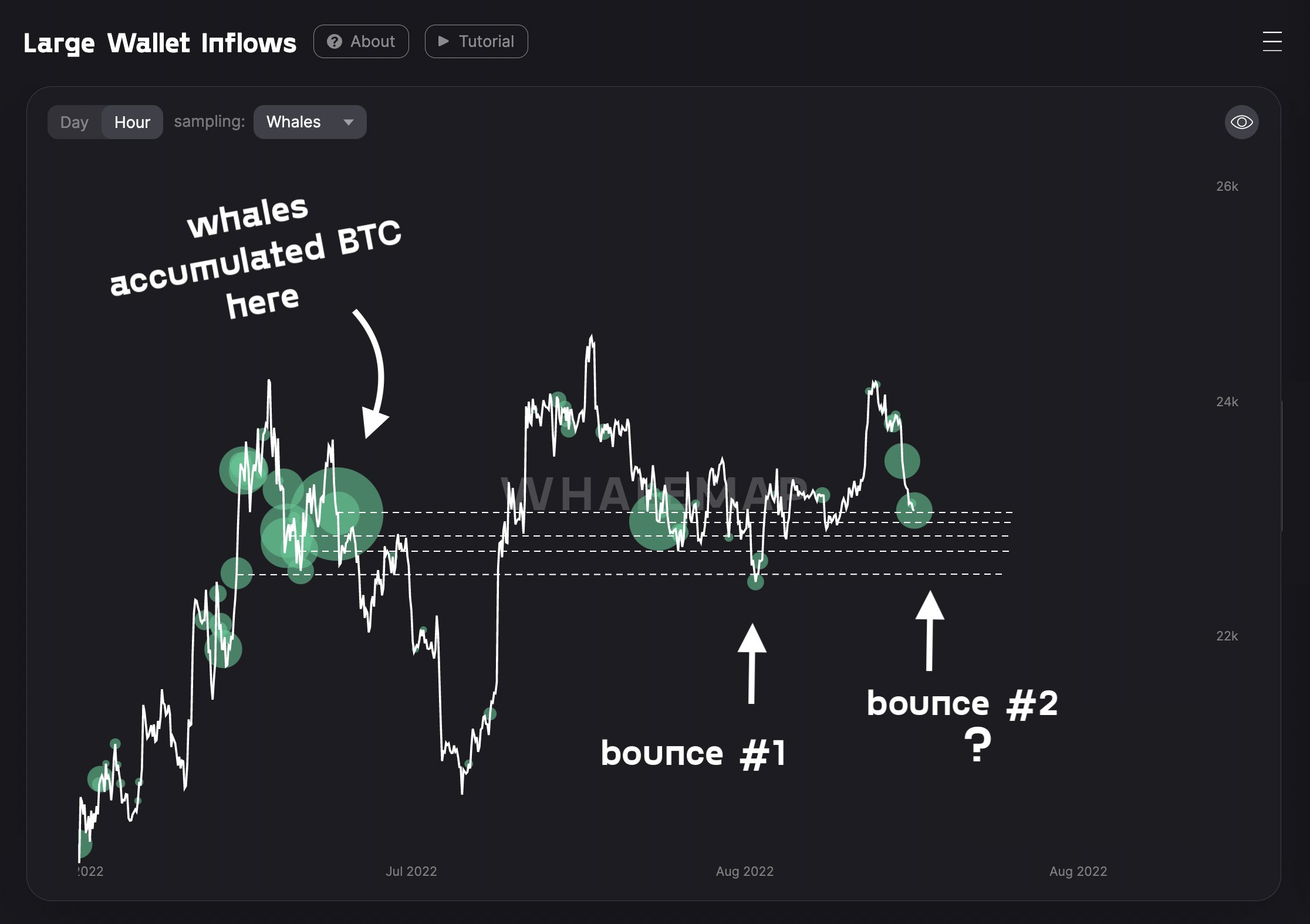 “$BTC is back to the whale accumulation area,” the Whalemap team summarized on Aug. 9.