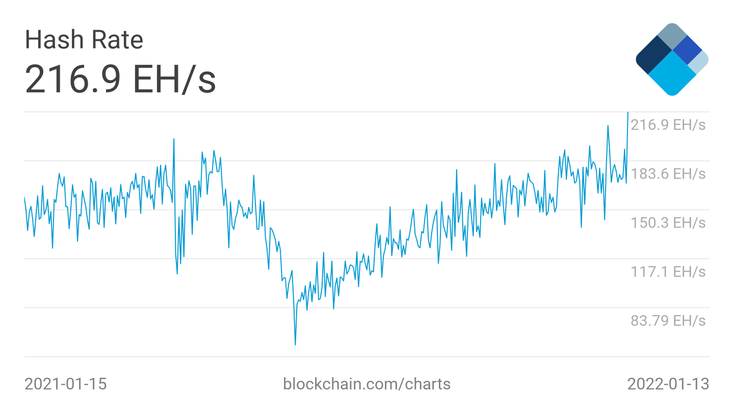 Despite falling a full $27,000 below all-time highs, BTC is more enticing than ever for miners. Hash rate, an estimate of the total processing power dedicated to mining, reached new all-time highs this week.
