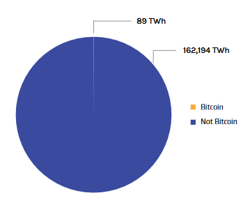 First, the CoinShares report goes into concrete numbers. For now, Bitcoin’s electricity consumption is compared to the total energy consumption elsewhere. The annual average for Bitcoin (as of December 2021) is 89 terawatt hours (TWh). This is a negligible portion (around 0.05%) of global energy consumption.