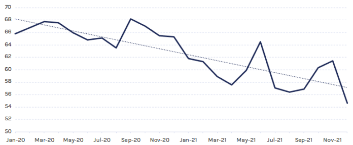 As of December 2021, there are around 5 million hardware devices in use to verify transactions on the Bitcoin blockchain. After the mining ban in China, there was a brief dip of an estimated 30 to 40%, but the number of mining devices quickly recovered. As expected, newer computers are more efficient than old ones, creating a race toward efficiency. As can be seen from the graph, this results in higher network efficiency over the years.