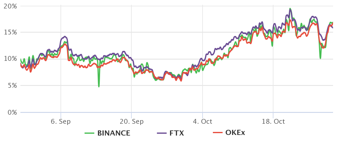 The indicator measures the difference between longer-term futures contracts and the current price at spot market exchanges. A 5% to 15% annualized premium is expected in healthy markets, otherwise known as contango.