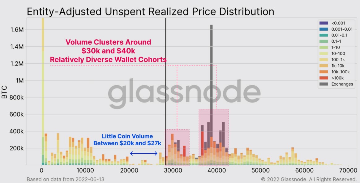 Part of the reason for the rapid sell-off on June 13 was the lack of demand in the $20,000 to $27,000 range as shown on the following entity-adjusted unspent realized price distribution chart.