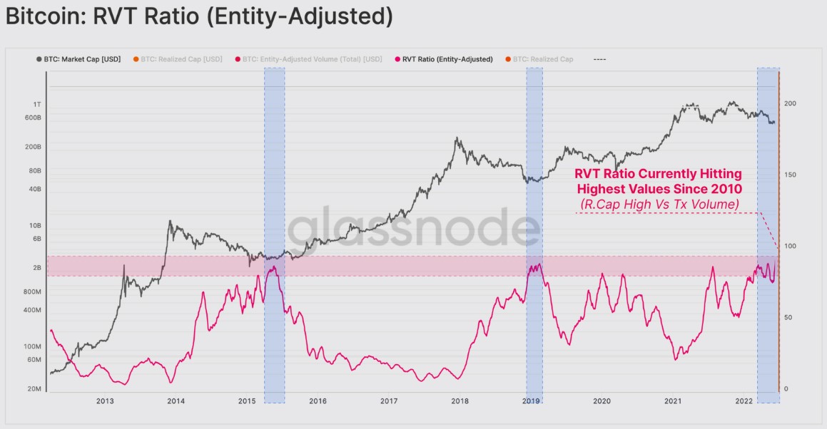 According to the RVT Ratio, which compares the realized capitalization against the daily volume settled on-chain, “the network valuation is now 80 times larger than the daily value settled” which indicates a low amount of on-chain activity.