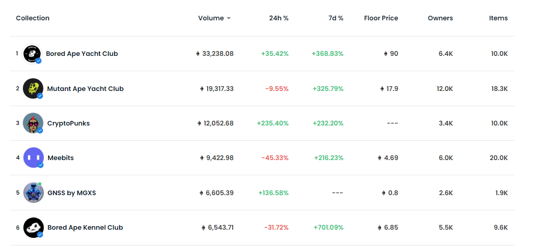 According to CryptoSlam and OpenSea, Bored Ape Yacht Club (BAYC) has been the top-selling NFT collection over the past months with a weekly trading volume of roughly 100 million dollars. The second most popular NFT collection in terms of weekly sales volume is the sibling Mutant Ape Yacht Club (MAYC) which has generated over $50 million in volume.