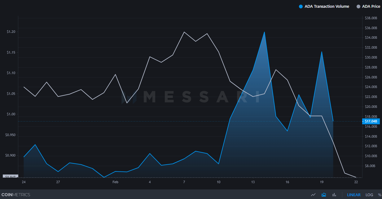 Overall, this month has seen tremendous activity on Cardano. On Feb. 14, 24-hour transaction volume topped $35 billion and on Feb. 19 it reached $31 billion. However, it is still far from the $138 billion all-time high in the volume set on Sept. 3 last year.