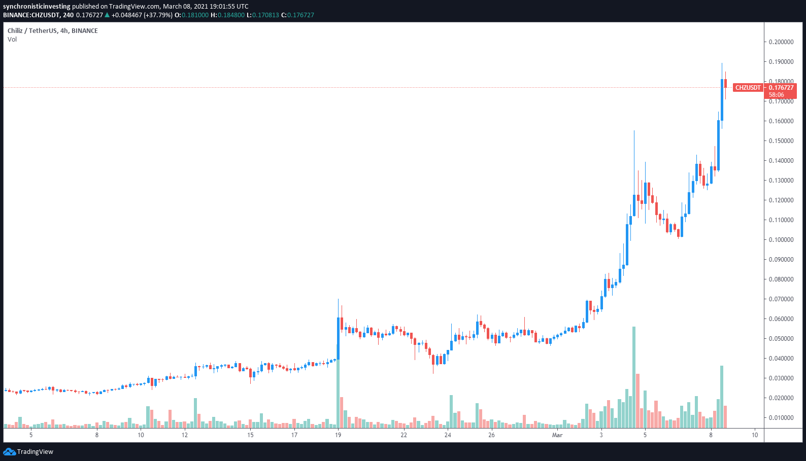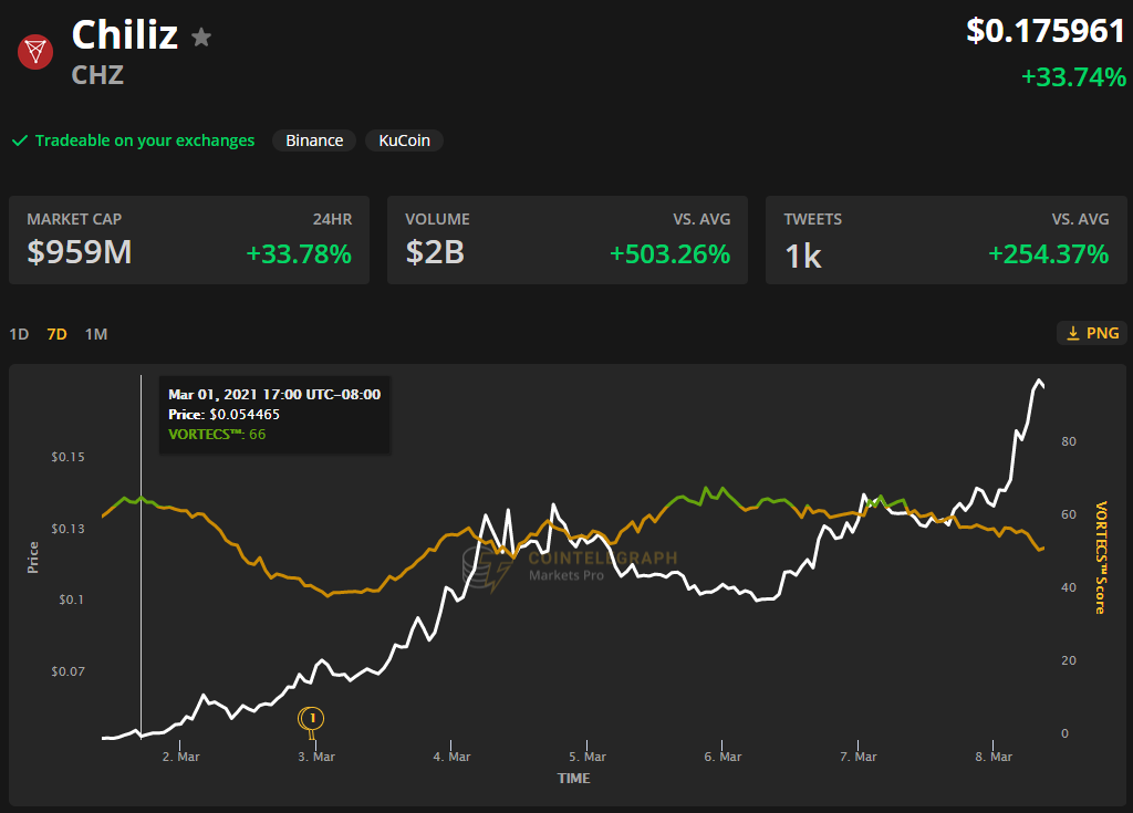 Data from Cointelegraph Markets and TradingView shows that over the past month, the price of Chiliz (CHZ) has increased 760%, going from $0.022 on Feb. 8 to a new all-time high of $0.189 on March 8. CHZ trading volume also hit a 24-hour record at $1.92 billion.