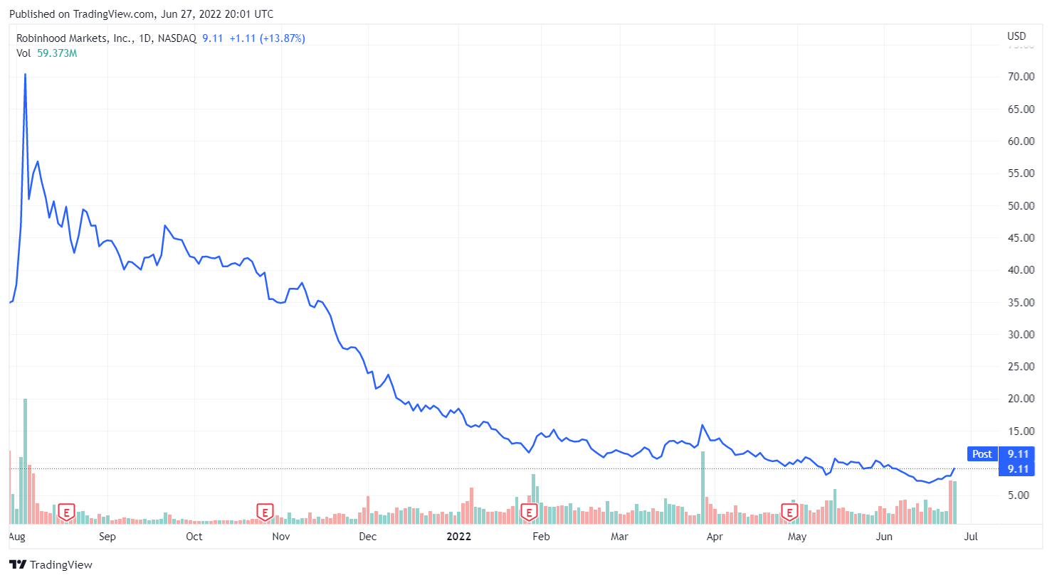 As for Robinhood, the discount brokerage platform has lost roughly three-quarters of its value since debuting on the Nasdaq stock exchange in July 2021. The company’s share price was up 13% on Monday but is still down over 75% from its initial public offering.