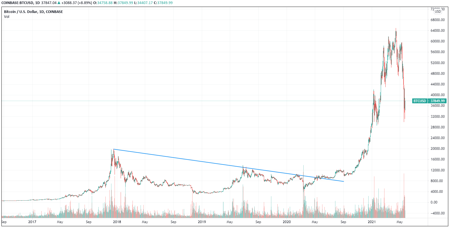 Bitcoin has been one of the best performing assets since its inception. This potential does not come without a price. Assets that embody exponential growth do not continue their price rise gradually. Sometimes it pays off to look at the price trajectory of Bitcoin and other cryptocurrencies from a more distant lens. Despite the price plunge of the last few days, Bitcoin still shows an increase in value of just over 220% compared to the beginning of the current bull run at the end of October 2020. Over the last five years, the digital currency put up an impressive 8600%, which equates to an average annual return of over 1700%. This is despite the fact that the cryptocurrency went through a three-year period of falling prices, a so-called bear market, since the winter of 2017/2018.
