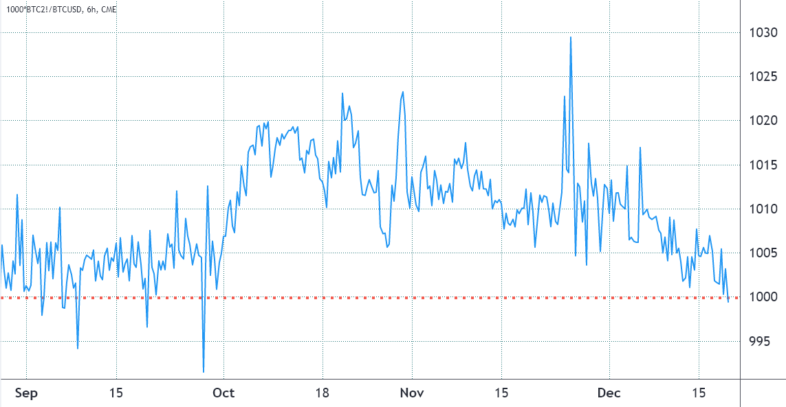 The worsening mood from investors was reflected in the CME’s Bitcoin futures contracts premium. The metric measures the difference between longer-term futures contracts to the current spot price in regular markets.