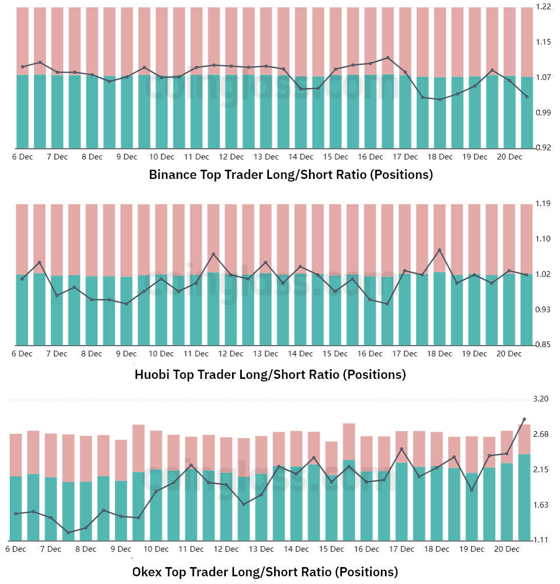 Despite Bitcoin’s 19% correction since Dec. 3, top traders at Binance, Huobi, and OKEx have increased their leverage longs. To be more precise, Binance was the only exchange facing a modest reduction in the top traders’ long-to-short ratio. The figure moved from 1.09 to 1.03. However, this impact was more than compensated by OKEx traders increasing their bullish bets from 1.51 to 2.91 in two weeks.