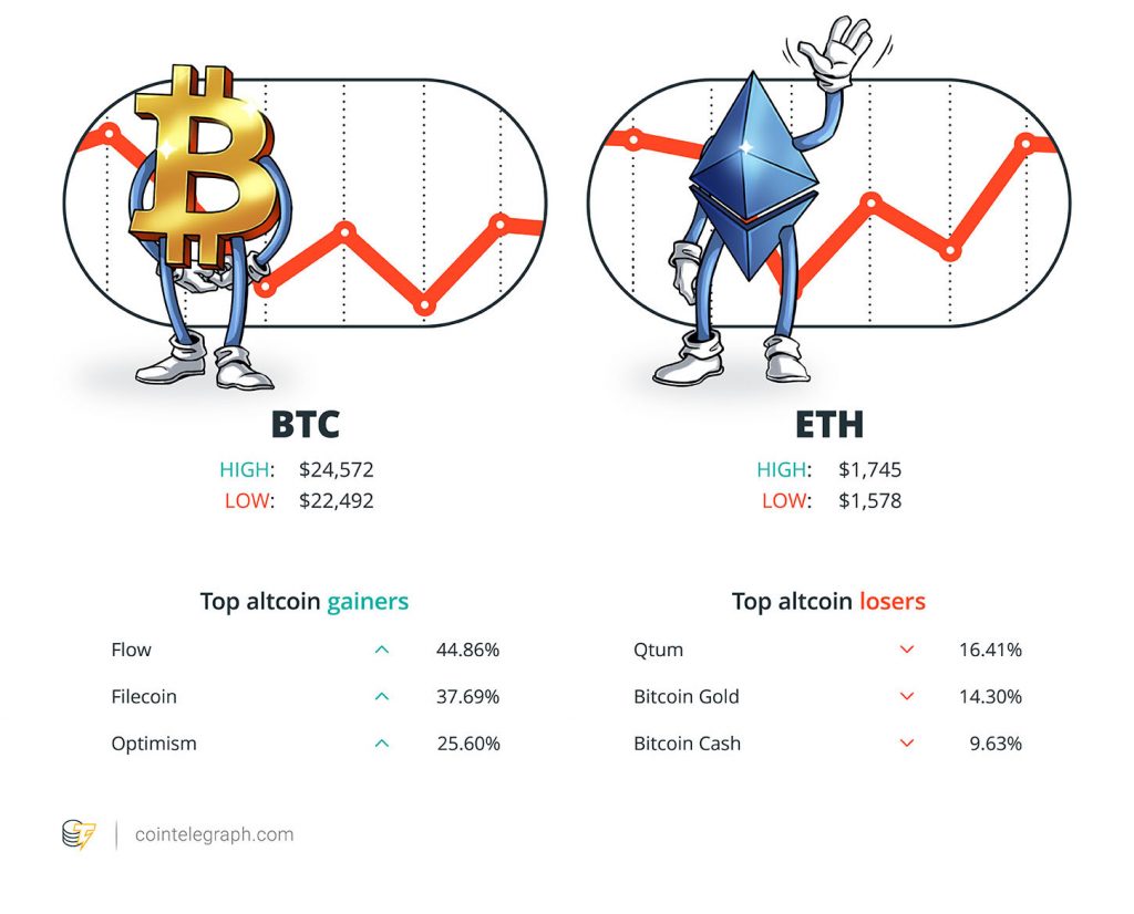 Among the biggest 100 cryptocurrencies, the top three altcoin gainers of the week are Flow (FLOW) at 44.86%, Filecoin (FIL) at 37.69% and Optimism (OP) at 25.60%.