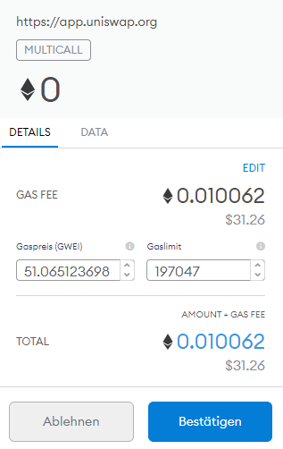 In the illustrated example, the user allows an exchange to be completed on the decentralized trading platform via the wallet “Metamask,”. Also visible are the network fees that are charged for this specific action.