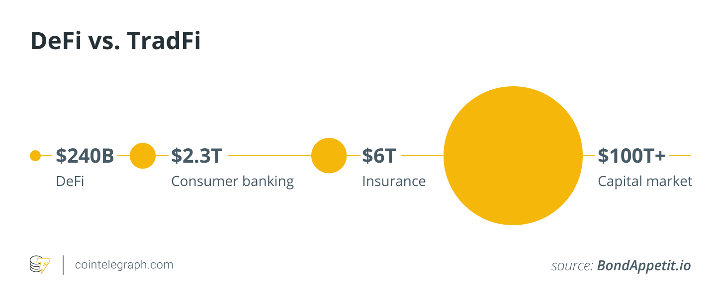 Most of these transactions originated from the DeFi services such as Uniswap, which facilitates over $1 billion swaps each day, as well as lending and borrowing protocols such as Aave, Compound and BondAppetit, with tens of billions in market size. While these are large numbers by any standard, it is only a decimal point of the trillion-dollar traditional finance (TradFi) industry.