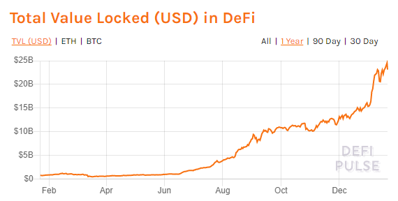 In 2020, a rapidly growing new field of applications has emerged on the platform: The field of decentralized financial applications (DeFi). In general, this refers to Ethereum-based applications (dApps) that offer financing in exchange for collateral in the form of crypto assets through smart contracts. Accordingly, in the DeFi space, traditional financial services are transformed into transparent protocols that do not require intermediaries. The total value deposited in DeFi protocols is at all-time highs, currently reaching $23.14 billion. As a result, Aave (AAVE) was the first DeFi token to make it into the top 20 highest capitalized tokens.
