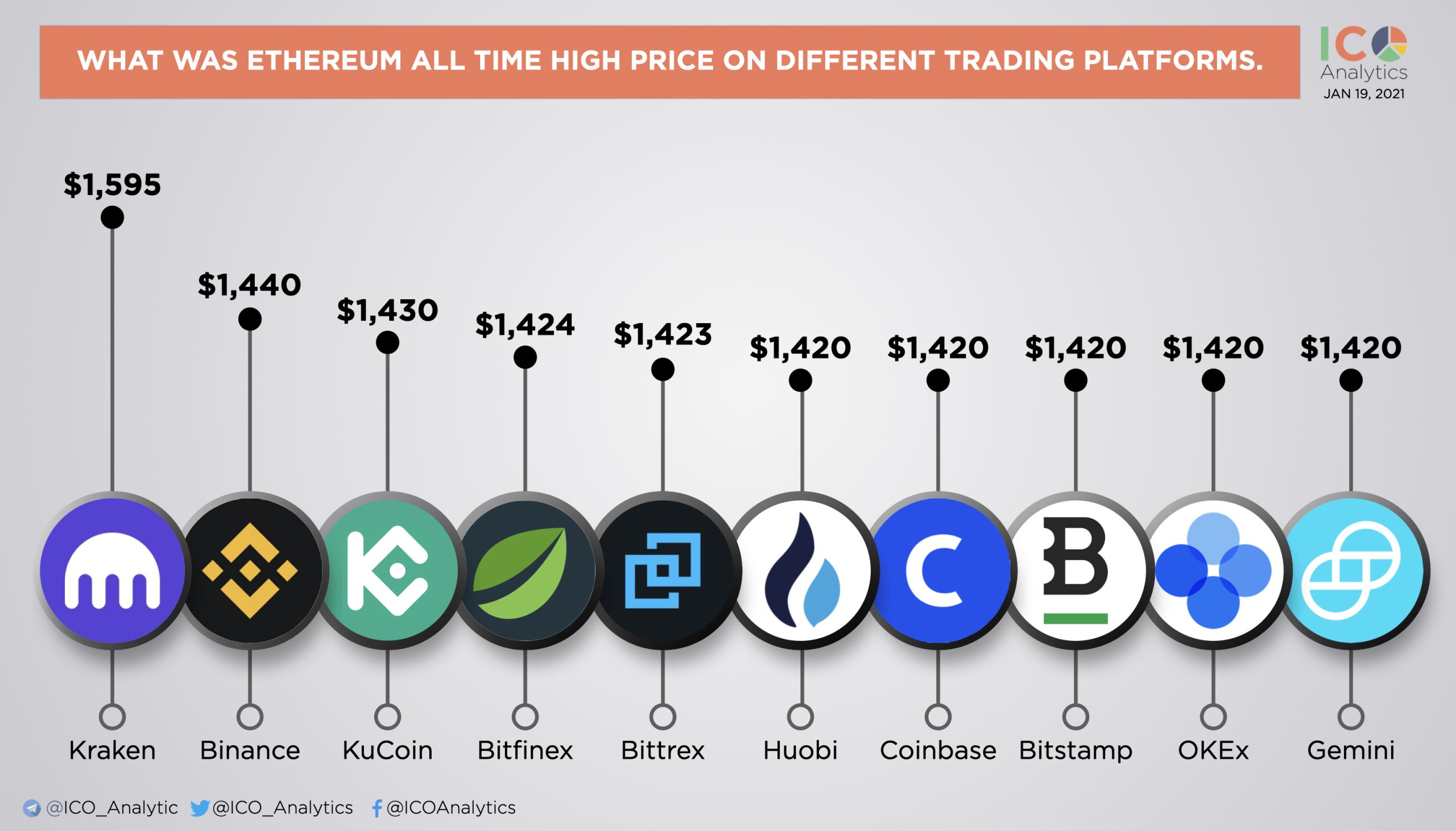 Since exchanges in the crypto market are their own marketplaces, independent from each other, Ethereum’s all-time high reached in January 2018 differs depending on the exchange. On most exchanges, the all-time high was marked just above $1,400.