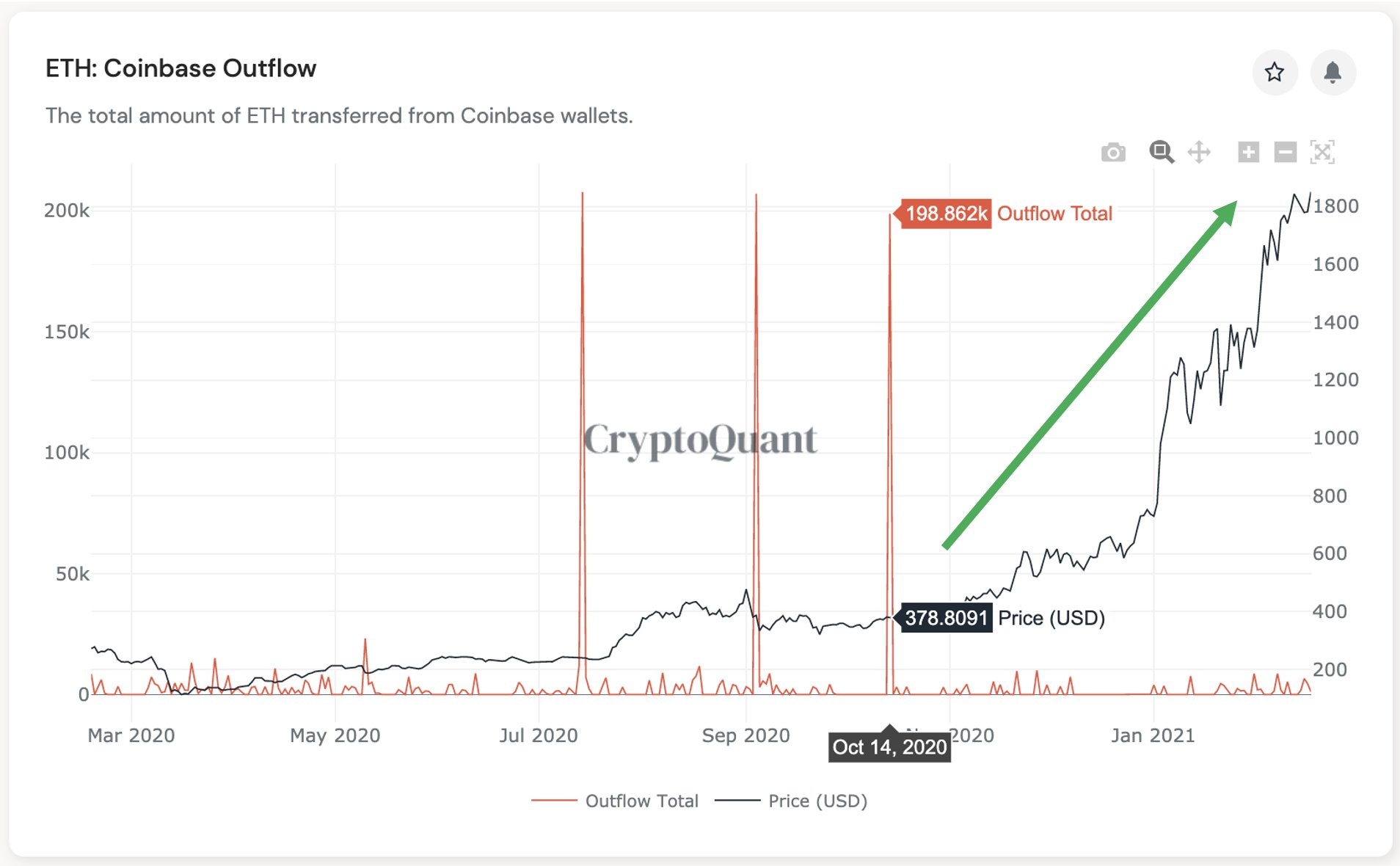 Published by Ki Young Ju, CEO of on-chain analytics service CryptoQuant, withdrawal figures for Coinbase show three very large tranches of around 200,000 ETH leaving the exchange for private wallets in 2020.