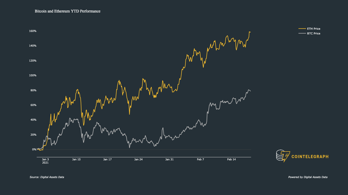 As Cointelegraph reported, Ether’s gains have outstripped Bitcoin in 2021, with year-to-date gains of 164% versus around 85% for BTC/USD.