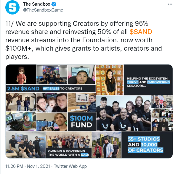 As a way to demonstrate the project’s focus on helping creators develop their brands, The Sandbox gives creatives 95% of the revenue generated by the items that they sell on the platform and 50% of all SAND revenue streams are reinvested into the Sandbox Foundation.
