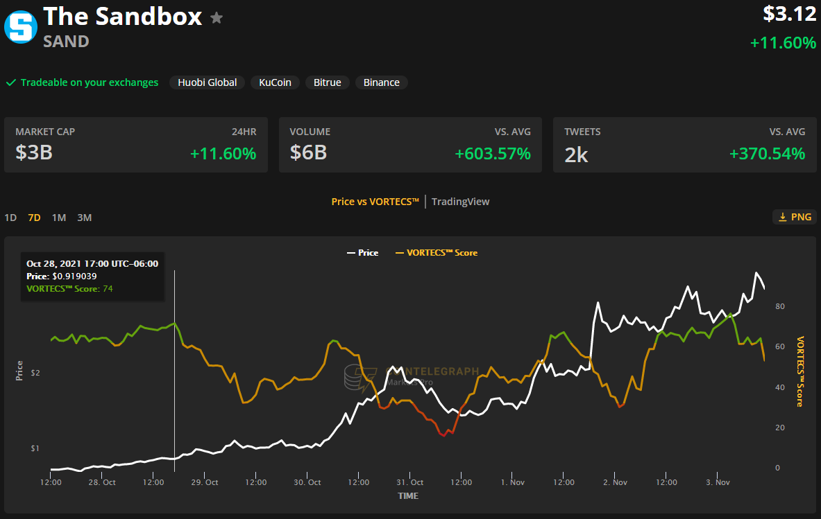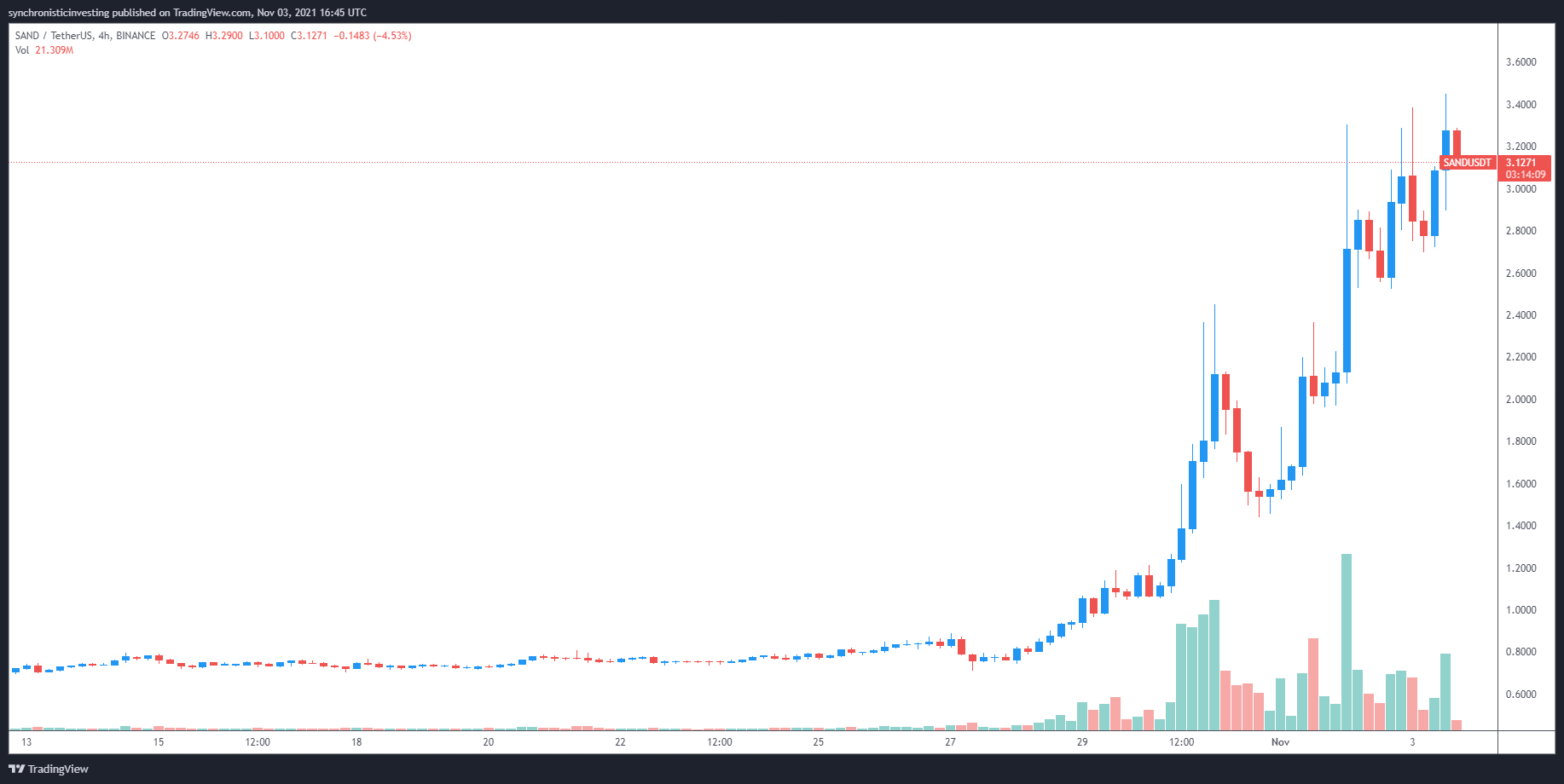 Data from Cointelegraph Markets Pro and TradingView shows that after hitting a low of $0.70 on Oct. 27, the price of SAND has stormed 393% higher to reach a new all-time high at $3.45 on Nov. 3 as its 24-hour trading volume surged to $9 billion.