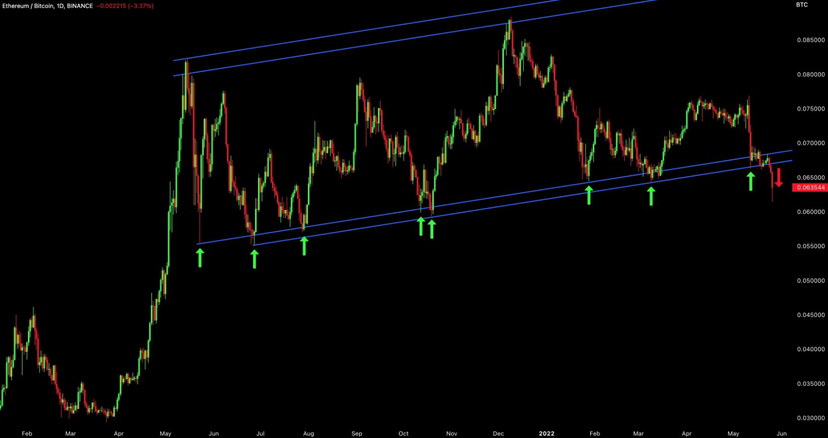 According to economist Caleb Franzen, the ETH/BTC pair lost a key support and this is notable because: