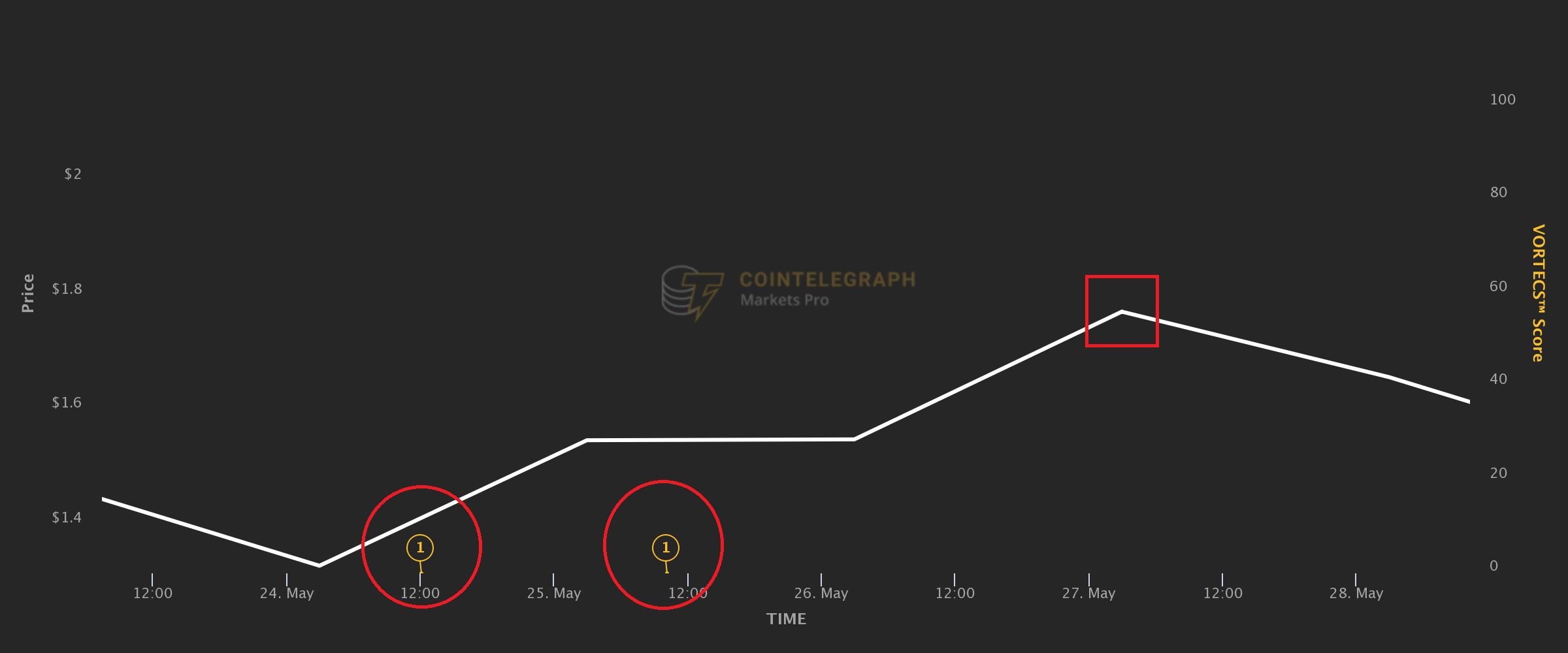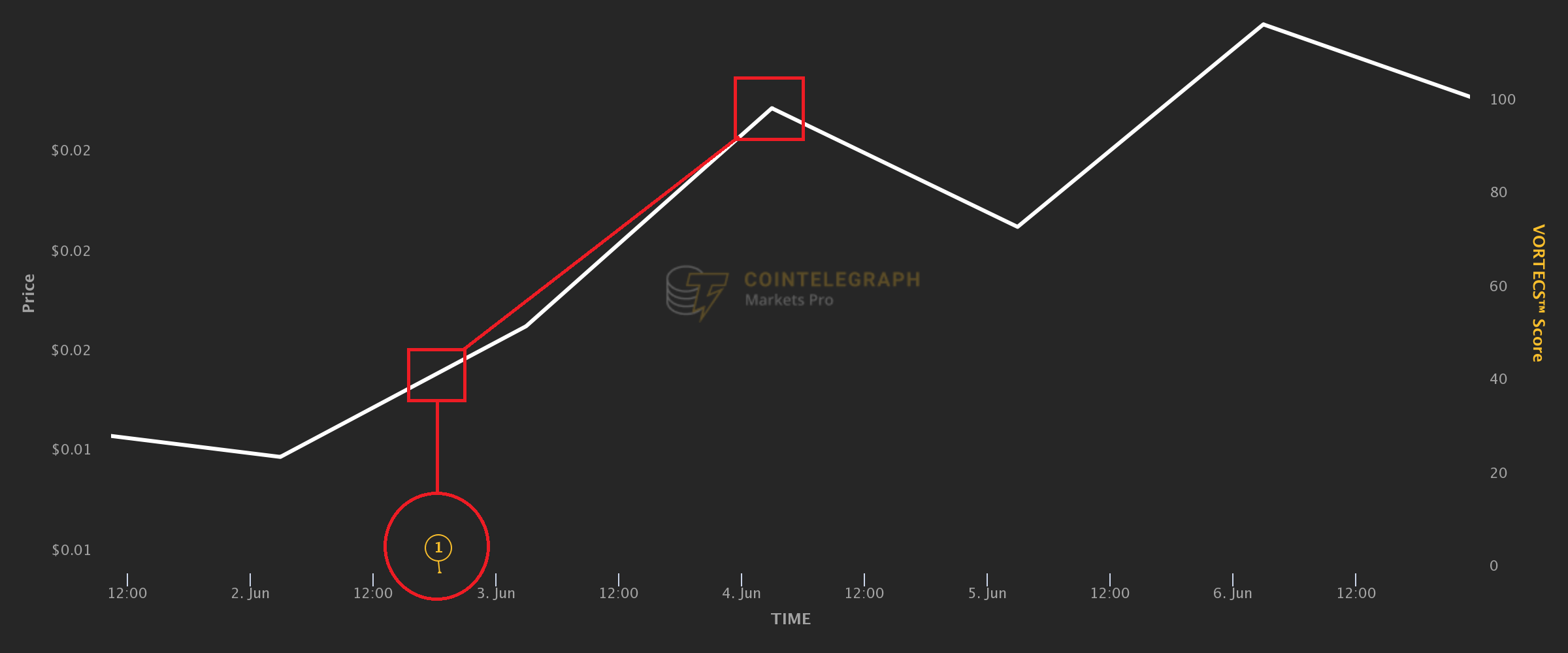On June 2, when the Nervos-Cardano partnership was announced on the company’s blog, it took Markets Pro less than 40 seconds to hit its subscribers with an alert, marked with a red circle in the chart. At that moment, CKB price was at $0.015 (first red box).