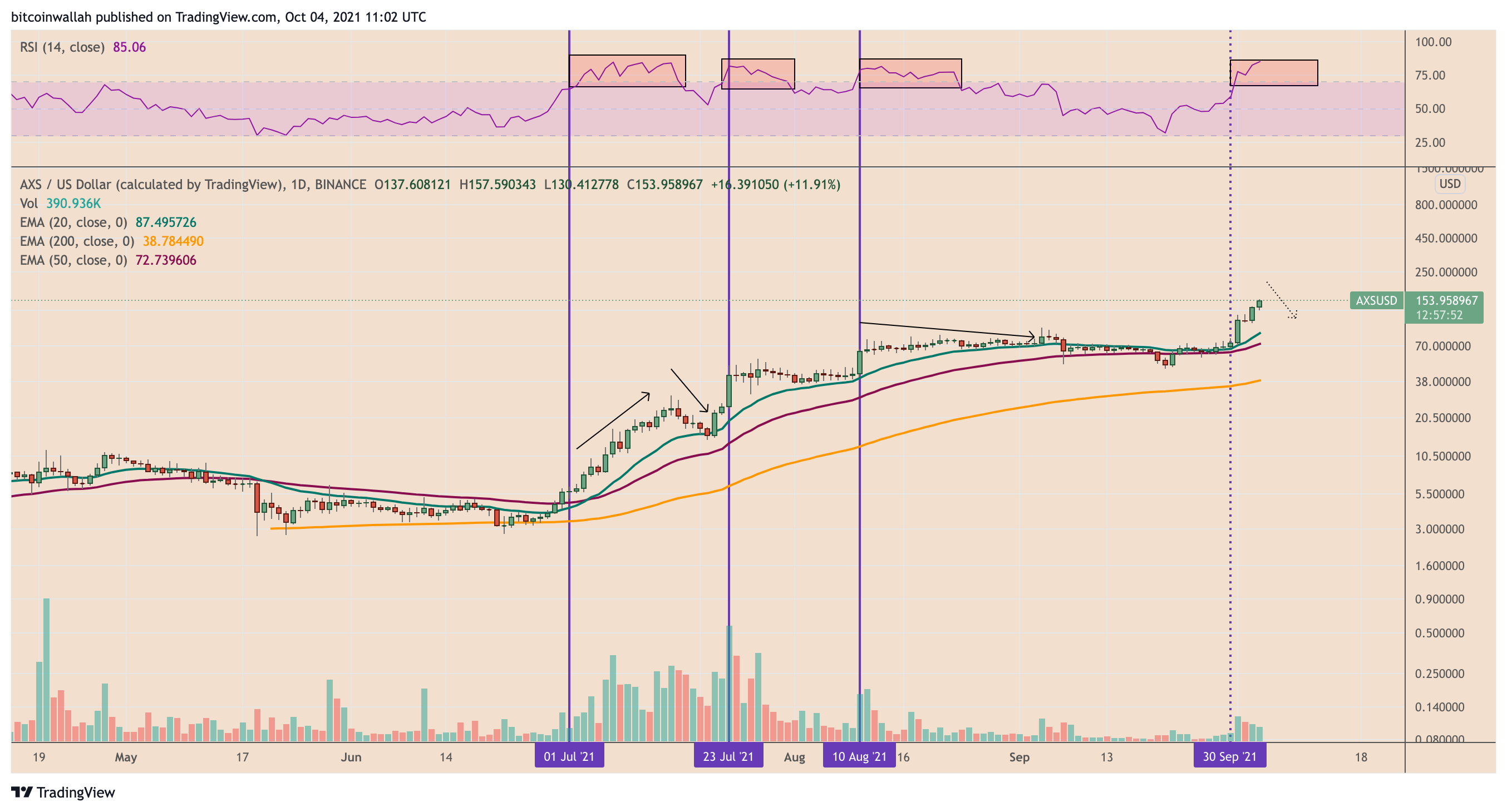 Therefore, it is visible that traders who did not sell their AXS holdings during the price corrections towards 20-day EMA managed to earn decent paper profits—the Axie Infinity token has climbed more than 2,500% since July 1.