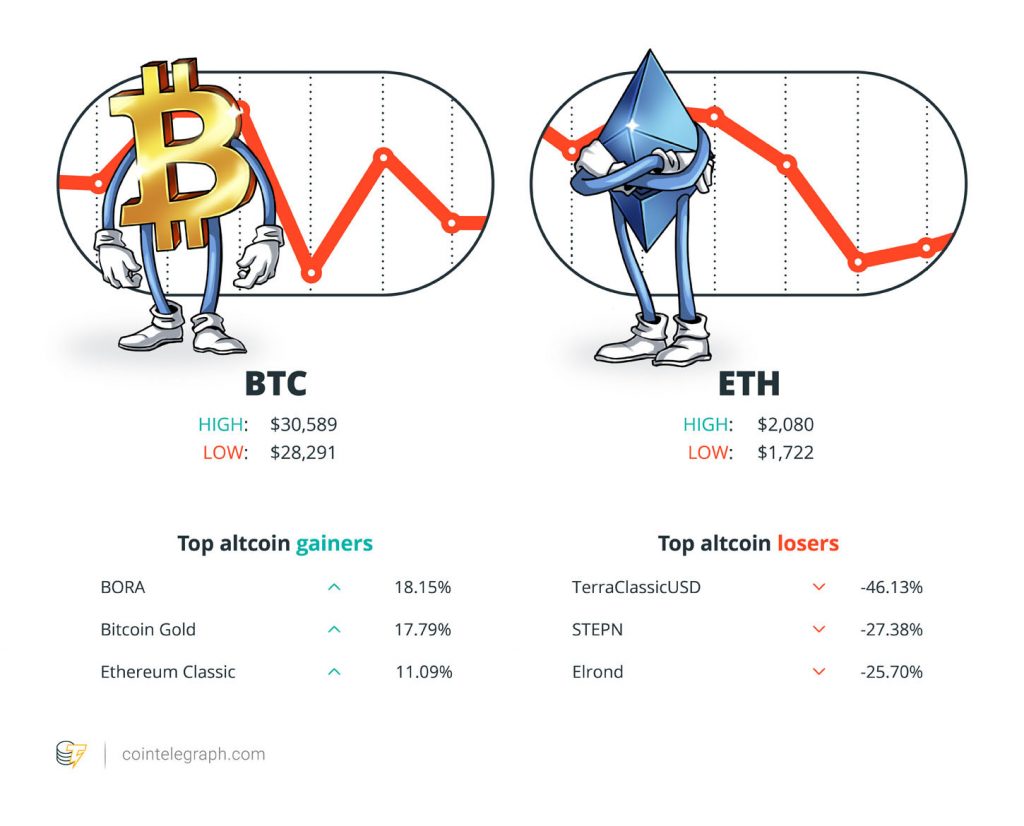 The top three altcoin losers of the week are TerraClassicUSD (USTC) at -46.13%, STEPN (GMT) at -27.38% and Elrond (EGLD) at -25.70%.