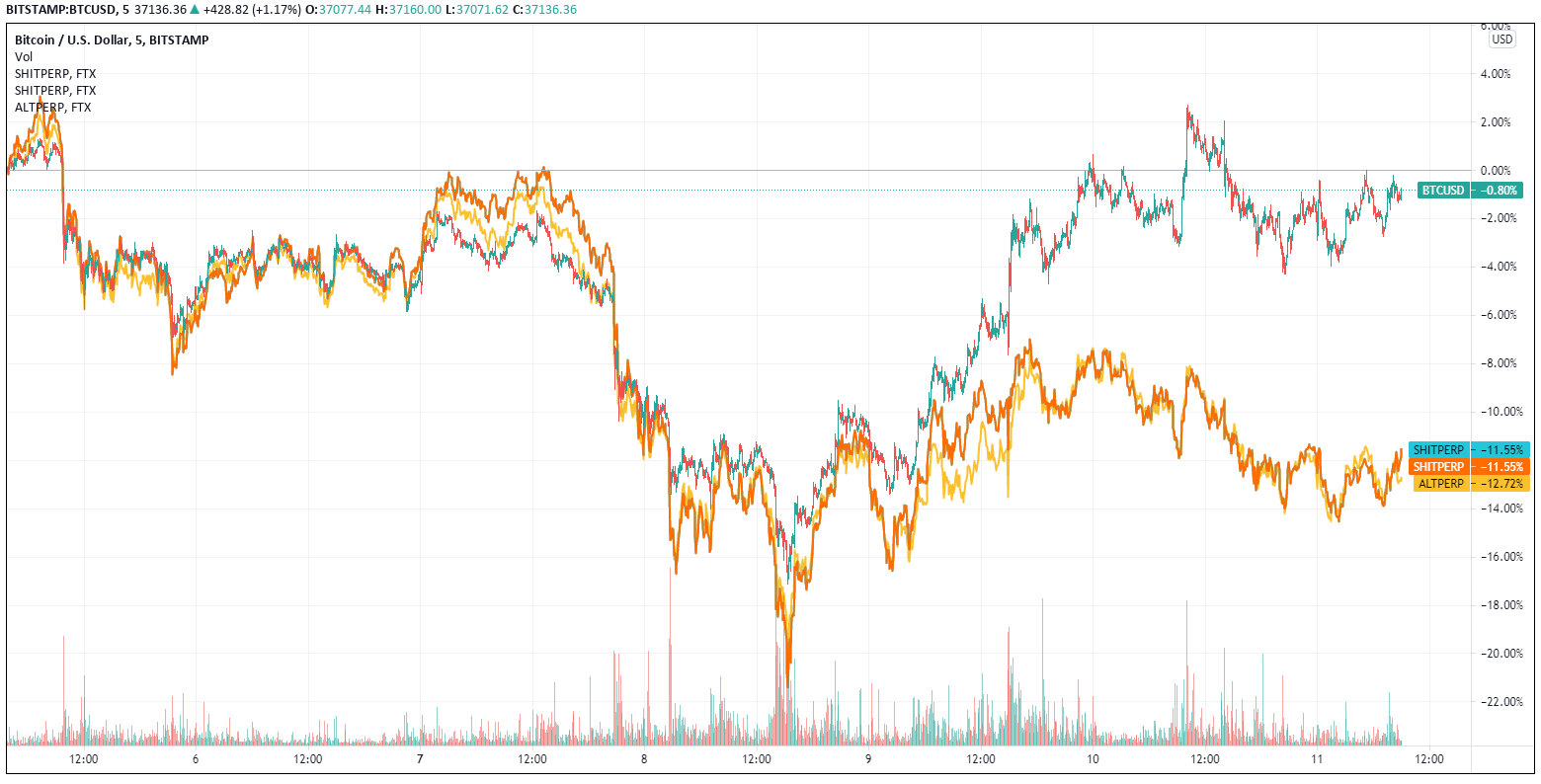 Since last Friday, the overall market has lost roughly 3.4% in market cap. Bitcoin (BTC) has outperformed (-0.5%) the overall market. Small caps in particular have suffered disproportionately this week (FTX SHIT Index -14%).