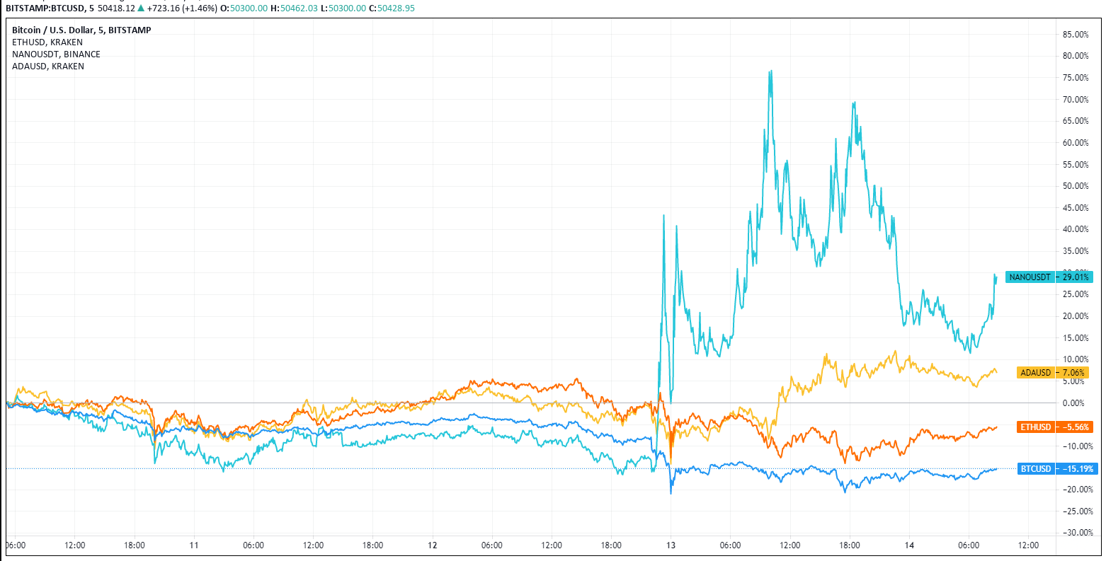 NANO was temporarily up 50%! The project is a decentralised next generation digital currency focused on addressing the inefficiencies present in existing cryptocurrencies. The more prominent Cardano (ADA) managed to reach an all-time high of almost $2.