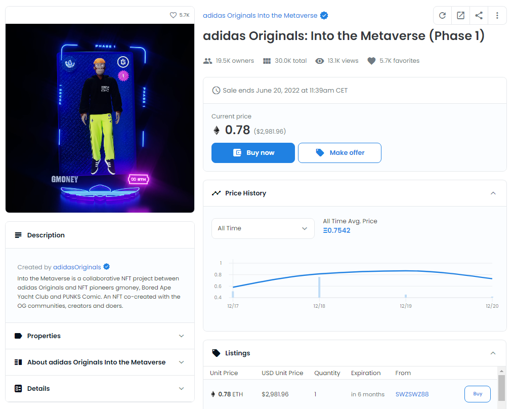Let us now move on to some more fun topics. Adidas launched their metaverse NFT drop of 30,000 pieces. Obviously, I did not get any at the drop, or at the early access sale that took place on December 14th (most of the NFTs went to well-programmed bots).
