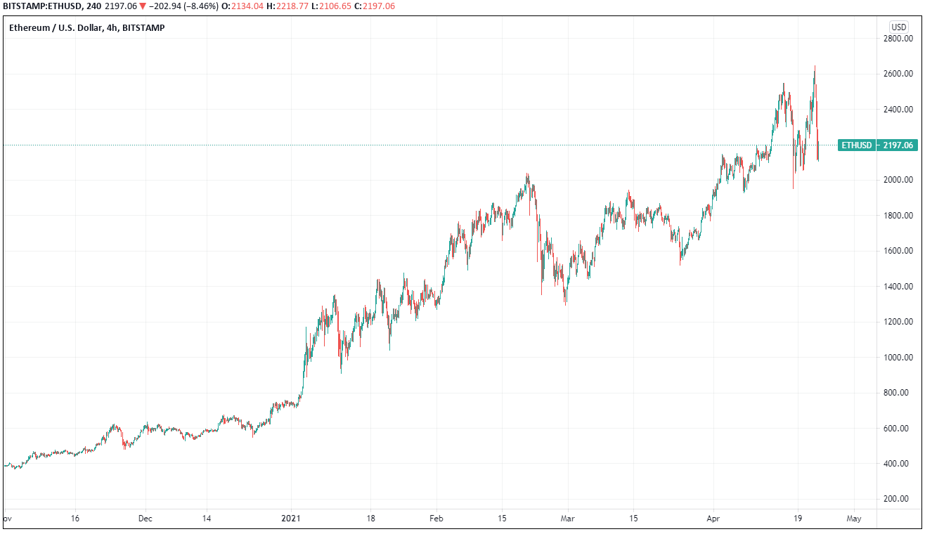Ethereum (ETH) reached a new all-time high of $2,650 while Bitcoin showed some weakness. However, the correction was about the same here as well. Currently, the price is around $2,200 . This is 25% below the all-time high.