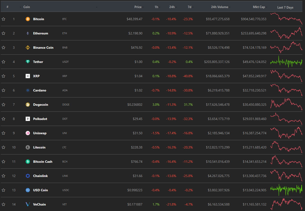 Not a single altcoin did not correct by double digits. Hardest hit: Vechain (VET) -23.3%, Ripple (XRP) -19.4%, Litecoin (LTC) -17.9%, Bitcoin Cash (BCH) -17.4%, and Uniswap (UNI) -17%. Also, in the 30-day time frame, only one token saw an increase in price: Dogecoin (DOGE) +31.7%.