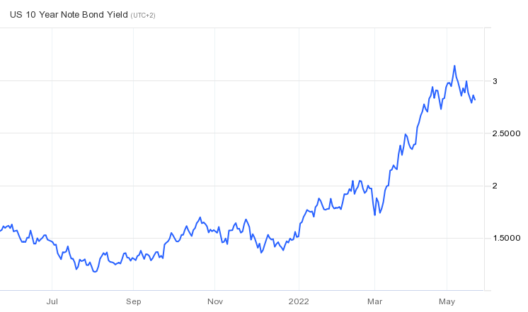 The market is seeing higher inflation numbers, which coupled with negative – or near zero – interest rates on safe heaven currencies (e.g. CHF) is causing the demand for USD to increase. The USD Currency Index (DXY) went from 96 on January 2022 to 104 on May 14. It is now at 102 and if it takes a greater pullback, crypto will benefit as well. I still think that real inflation numbers are way worse from the ones of the CPI. I believe that the interest rate market is largely underestimating the real impact of tighter monetary policies. We could therefore see the 10y US Gov Yield well above 3%.