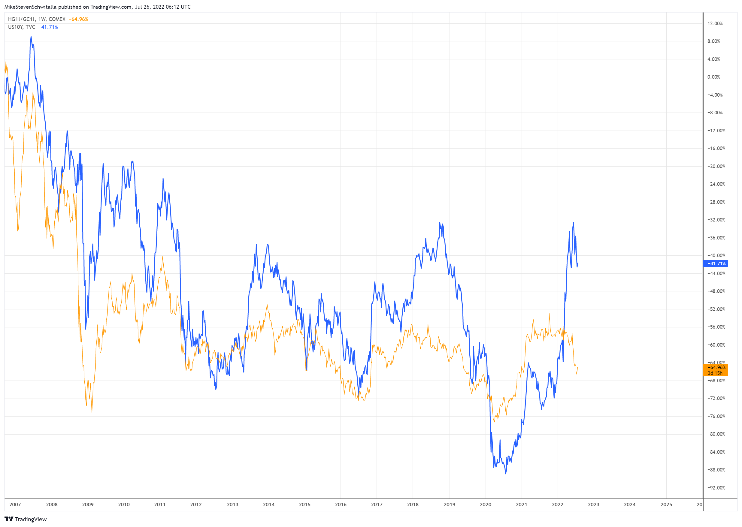 In terms of inflation, I see the pressure and momentum easing. Be it wheat, which is now trading 30% lower since the end of April, live cattle at -5%, coffee at -25% or copper with -25%. Especially copper, which is considered a good indicator of industrial demand, and is therefore also called Dr Copper, points to a significant cooling of the global economy. “Bond King” Jeffrey Grundlach’s favourite indicator is the so-called Copper-Gold ratio. Historically, this is a good leading indicator for the direction of the 10-year yield.