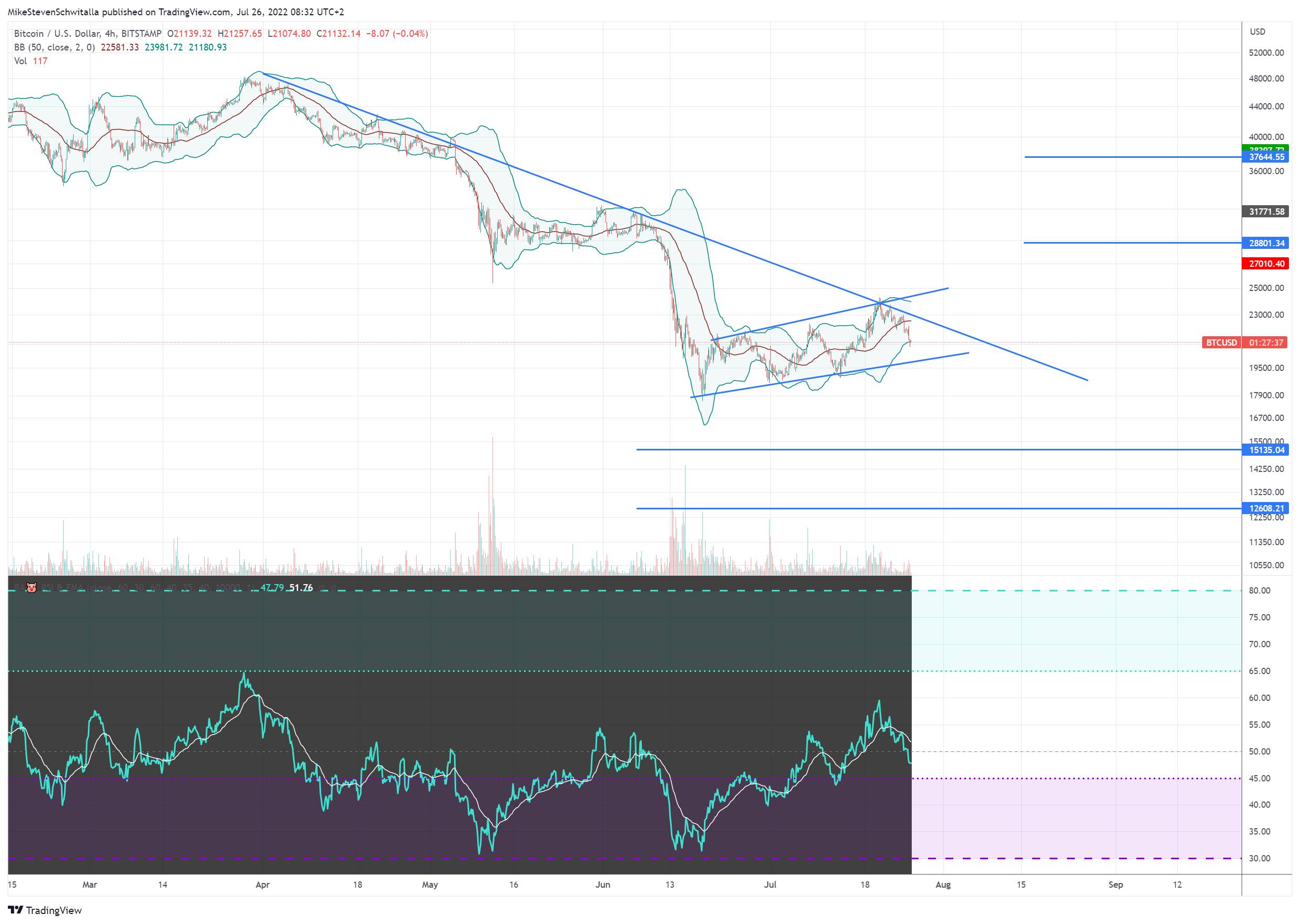 August will be interesting. An attractive technical set-up is forming. Looking at BTC, we can see the medium-term downtrend, which has been in place since April. Then again, we have been seeing an underlying slight uptrend since June. At the end of last week, we bounced off of the dowtrend line. The big question now is whether or not the market can break through this trendline. In case of a breakout, prices of USD 29,000 are possible in the short-term. If we cannot overcome the downtrend, prices of USD 15,000 are probable. My 2 cents on this: we will be seeing USD 15,000.