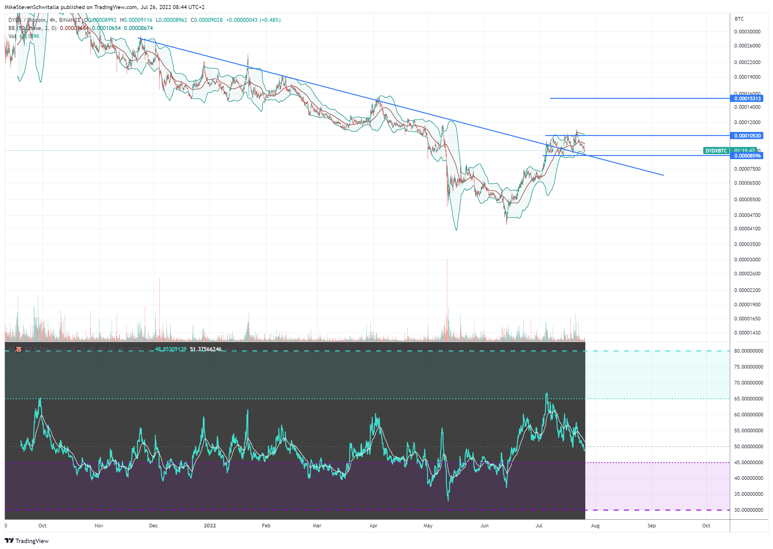 An interesting set-up is forming in DYDXBTC. On the one hand, I find the project exciting, and on the other hand, the downtrend, which has lasted since December, was broken to the upside. Currently, I see 0.000085 as the support, and at the same time a potential stop loss. I see a first resistance at 0.000105. After this resistance, I see a price potential of up to 0.00015.