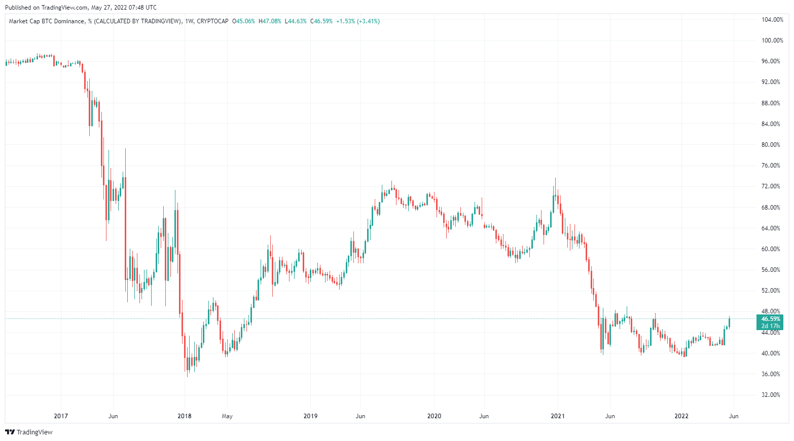 A more positive news is that Andreessen Horowitz recently announced a new fund for crypto and blockchain startups. The fund is set to dedicate $1.5 billion to seed investments, and $3 billion to venture investments. Despite the down of Bitcoin and Ethereum other layer 1 PoS cryptocurrencies suffered also really hard, with Solana trading more than 19% lower over the week, Avalanche 25%, and NEAR 17%. The relative weakness of all the altcoins pushed the BTC market cap dominance to 46.8%, the highest reading in 7 months.