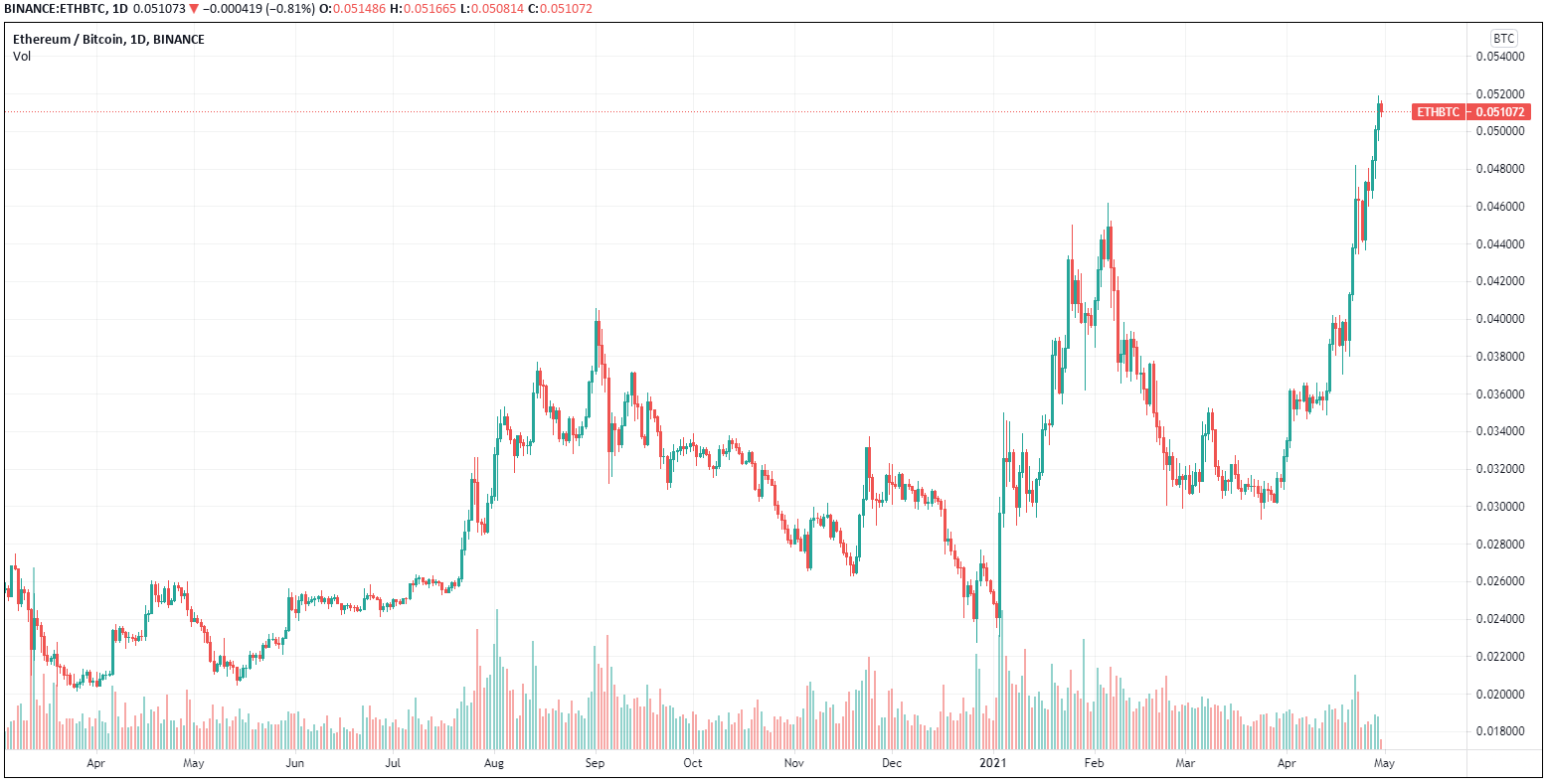 The overall trading volume in BTC decreased slightly, whereas the volume of Ether (ETH) increased on a daily basis towards month end. ETH also outperformed BTC by another 11.1%, and the spread ETH/BTC is currently trading at a market level of 0.05085.